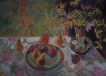 2014Rode uien, stoofperen, en een vaasje bloemen van de moestuin op een mooie geborduurde kleed. Krulwilg in achtergrond.