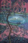 Een uitzicht van de waterleliegracht met waterfontein gezien door een appelboom